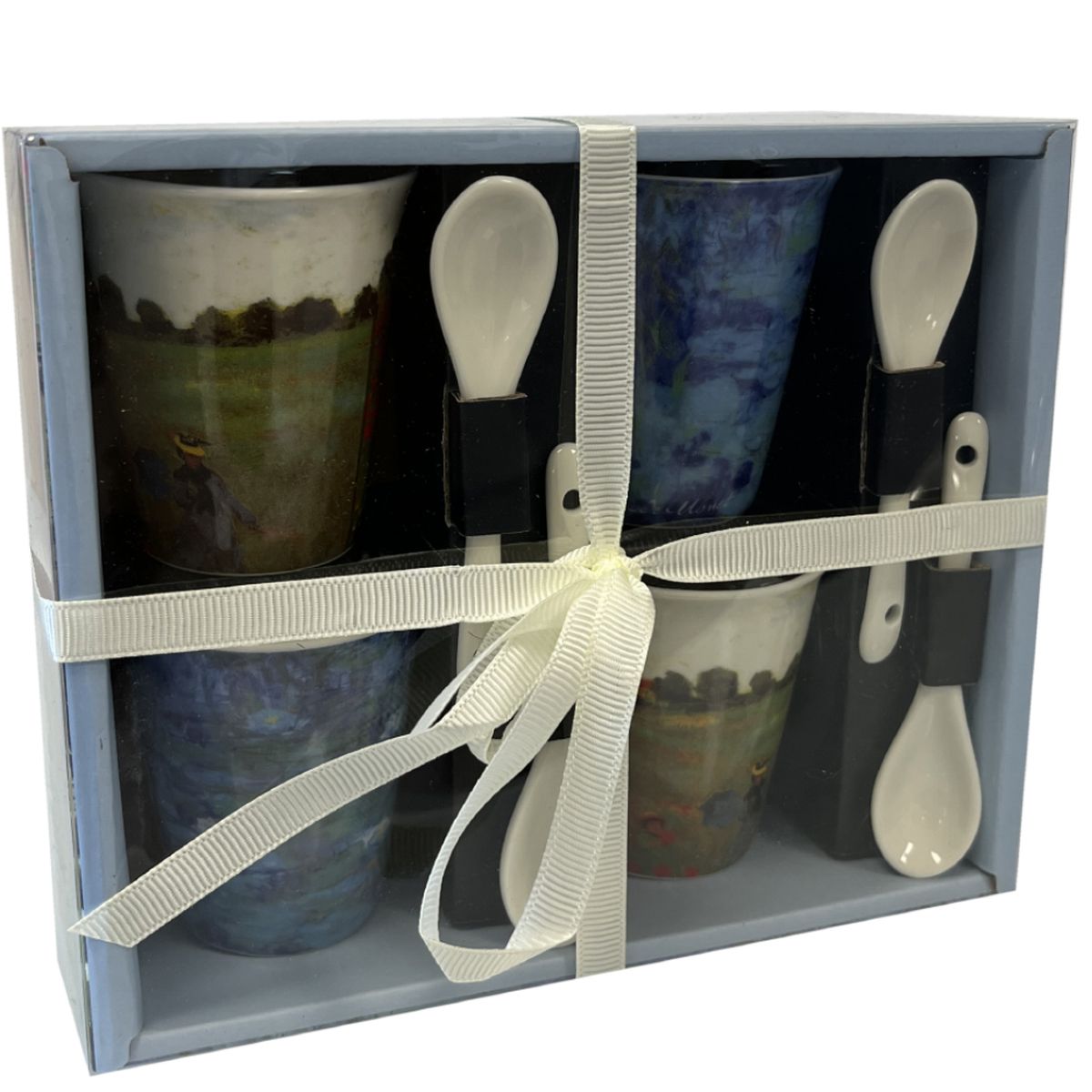 Coffret expresso Claude Monet Nymphéas et Coquelicots en boite cadeau Licence : Muzeum Couleur dominante : Vert et bleu Matière : en céramique Livré en coffret cadeau Ce set contient 4 Gobelets et 4 Cuillères. Dimensions d'un gobelet : Hauteur 7 - Diamètre 5.7 cm Dimensions de la boite cadeau : Hauteur 6.5 cm - Largeur 19 cm - Profondeur 16 cm Spécificités : Claude Monet (1914-1926)
