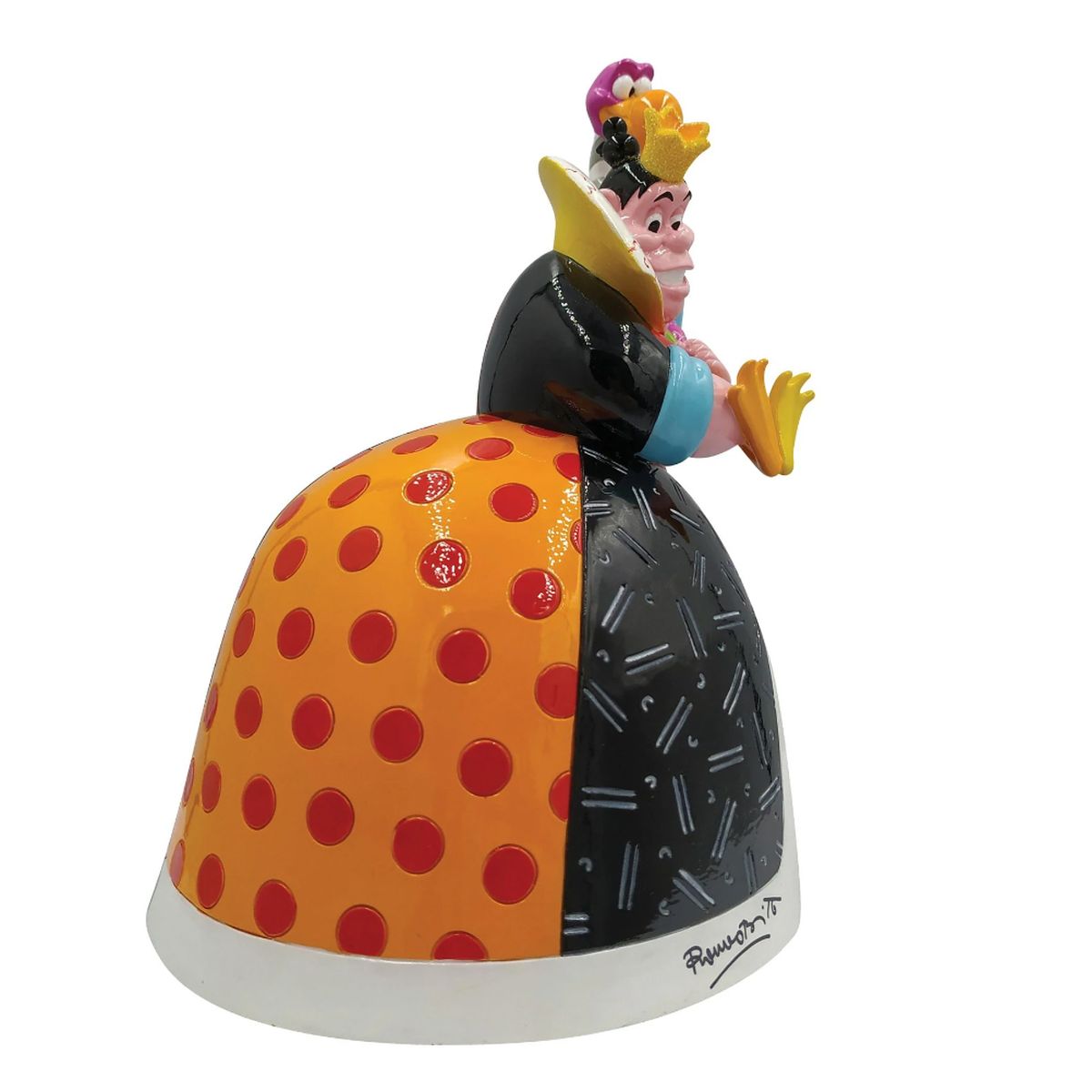 Redessinant l'antagoniste d'Alice et du pays des merveilles, la reine de cœur se refait une beauté à la mode glam et paillettes. Conçu aux États-Unis par l'artiste pop Romero Britto basé à Miami pour célébrer le 70e anniversaire du classique de Disney Alice au pays des merveilles. Le produit est fourni dans une boîte cadeau. Des variations de couleurs sont possibles car le produit est peint à la main. Ces figurines ne sont pas des jouets pour enfants. Destiné aux adultes uniquement.