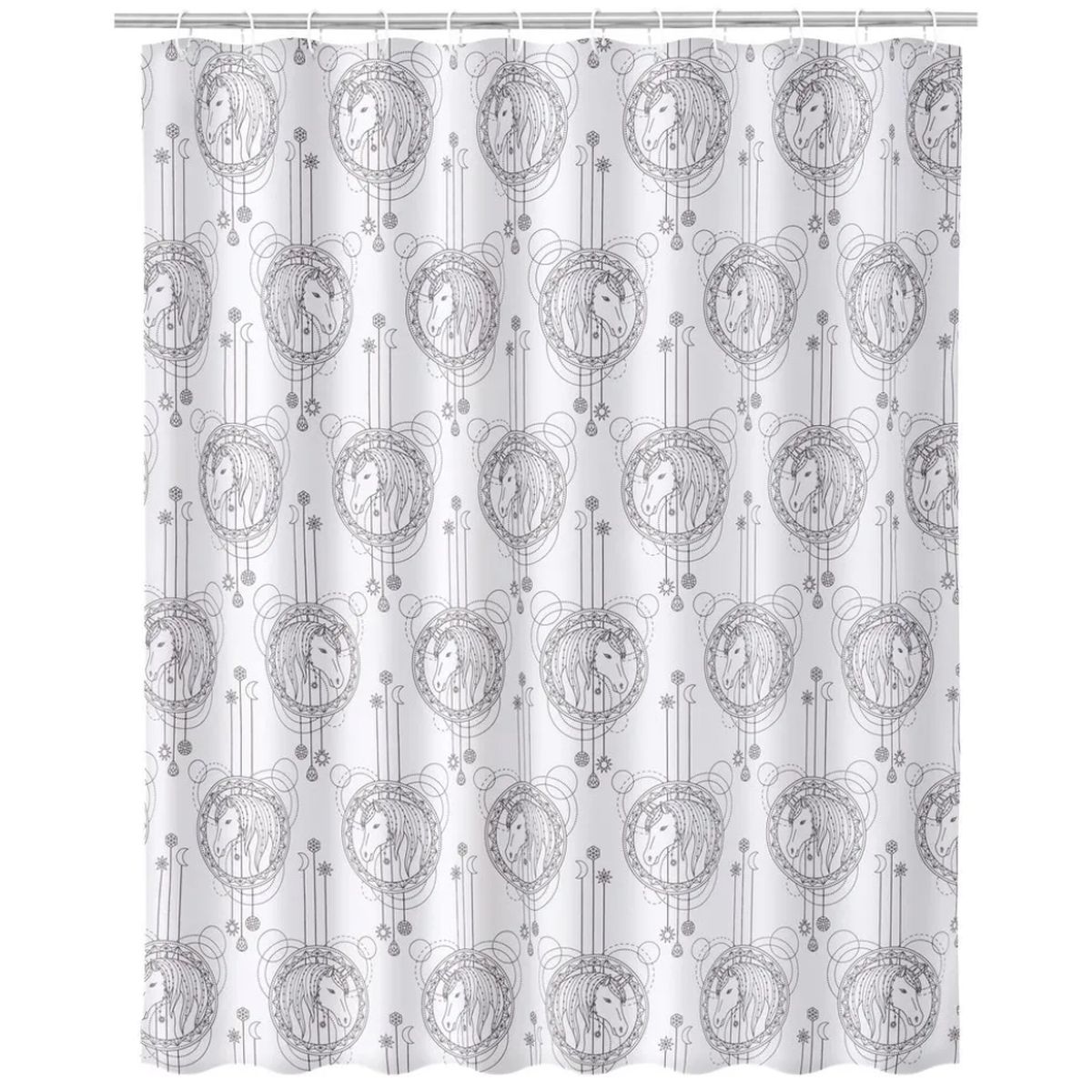 Rideau de douche Licorne 180 x 200 cm Couleur dominante : Blanc Matière : 100 % Polyester Dessin : imprimé Dimensions : largeur 200 x longueur 180 cm Ce rideau de douche est livré avec 12 anneaux en polypropylène blanc. Spécificités : Charlotte Boutik vous propose des accessoires déco, design, originaux ou insolites. Découvrez les dernières tendances femme et homme et trouvez le petit cadeau idéal. Que vous recherchiez l’accessoire utile, déco ou rigolo pour égayer le quotidien ! Conforme aux normes CE et sous licence officielle.